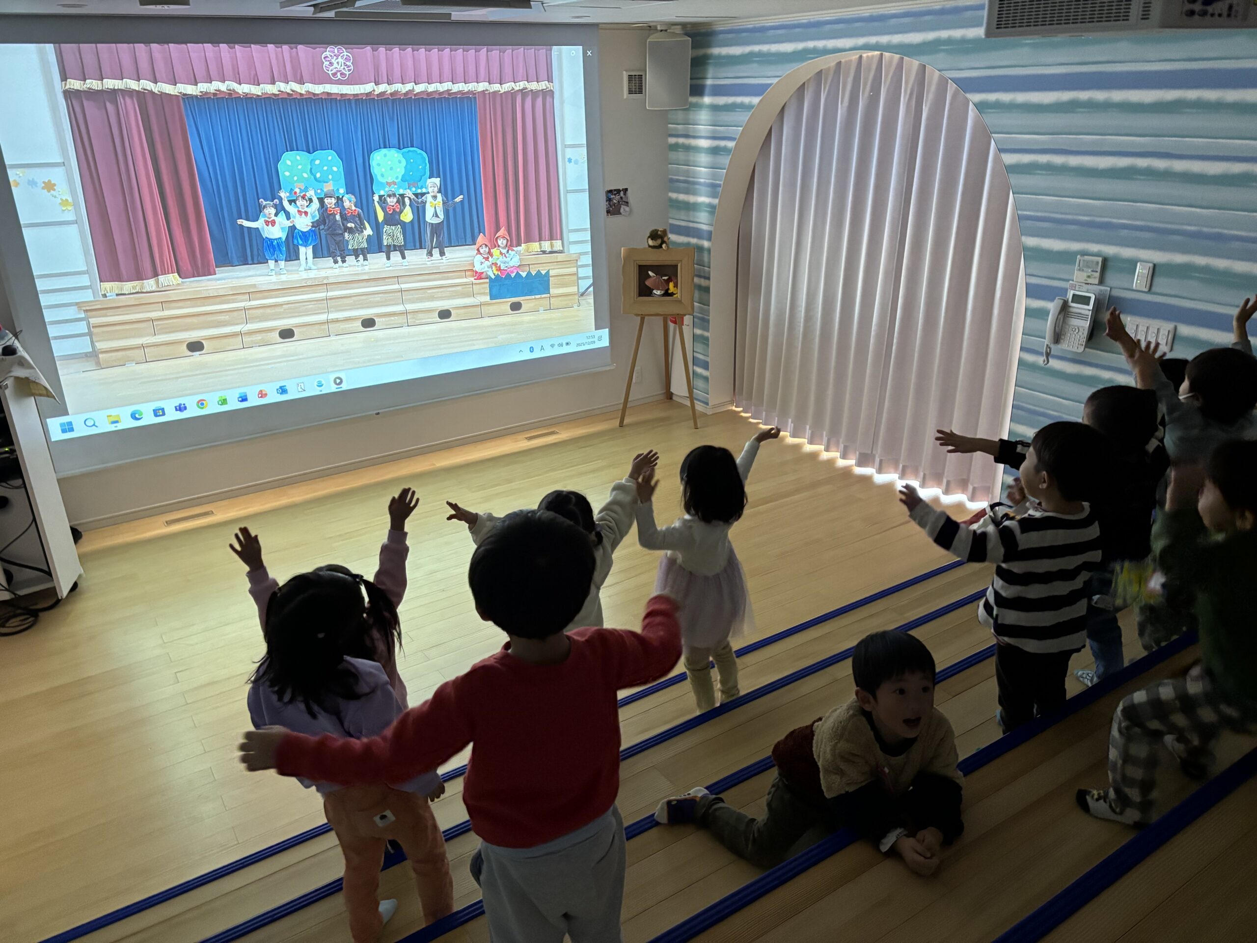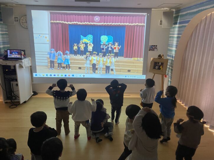 自分や友達を見つけたり、映像と一緒に踊ったり、本番の姿を見て楽しんでいました!