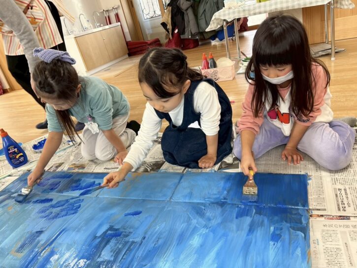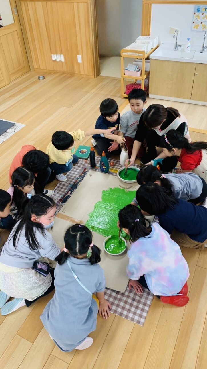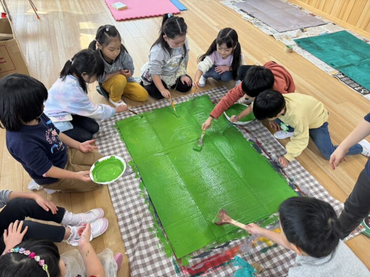 最初は段ボールに絵の具で色を塗りました🖌