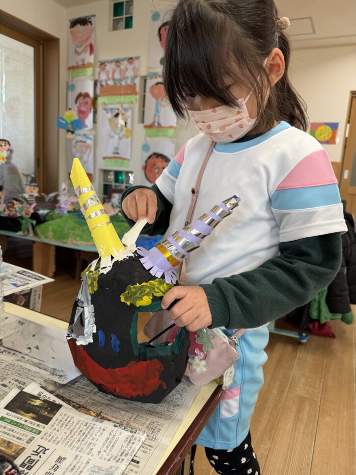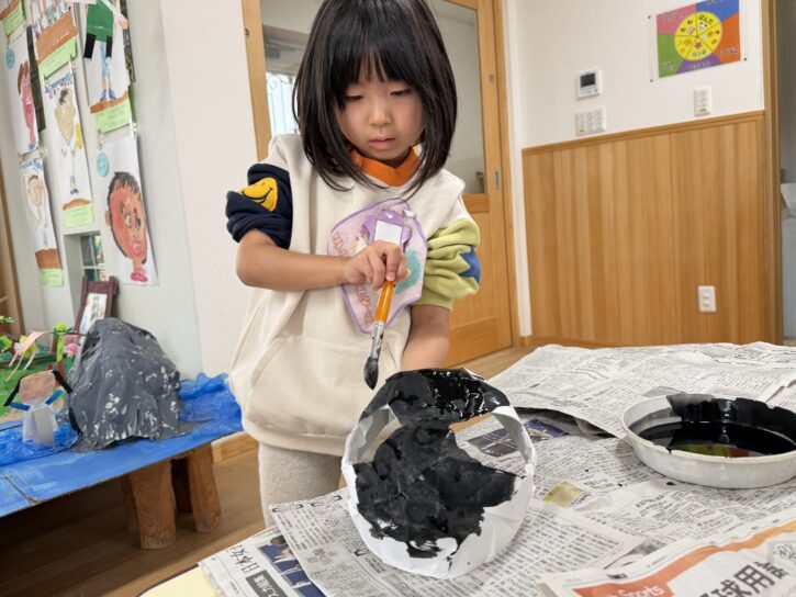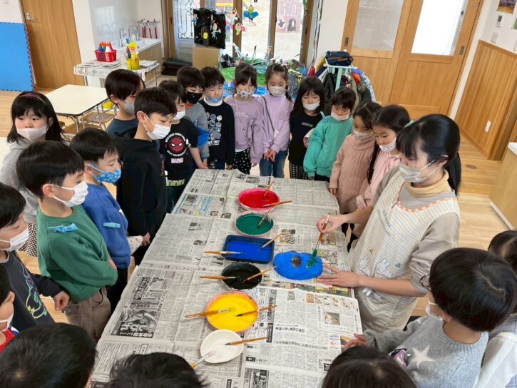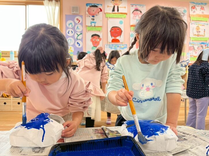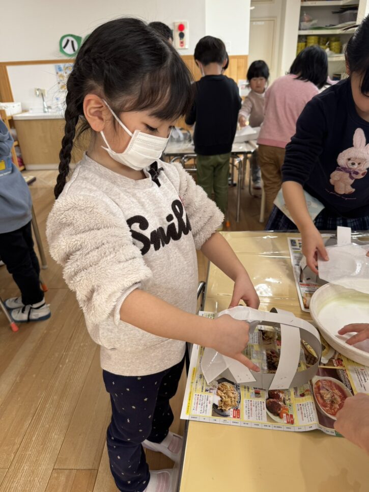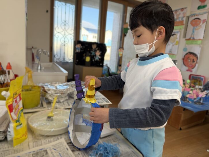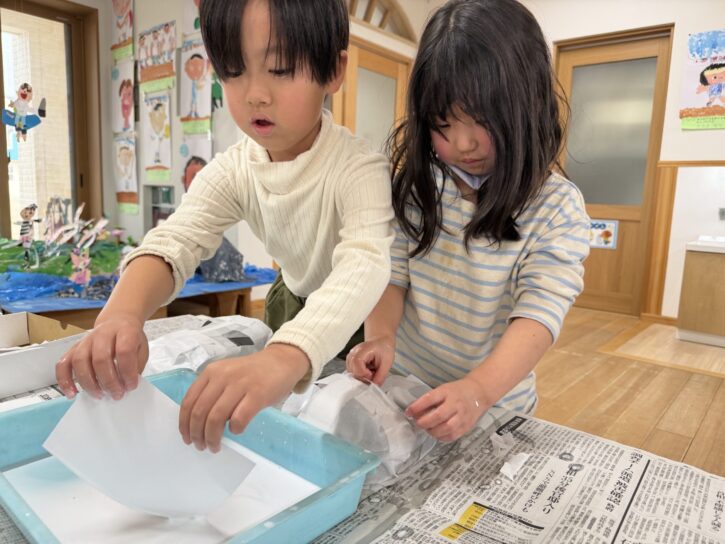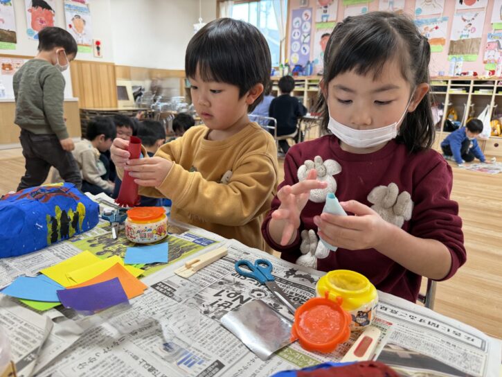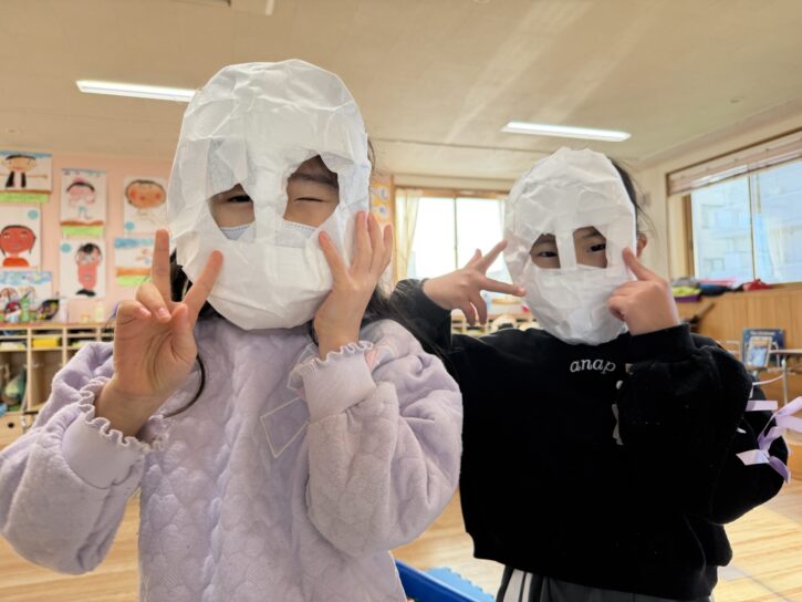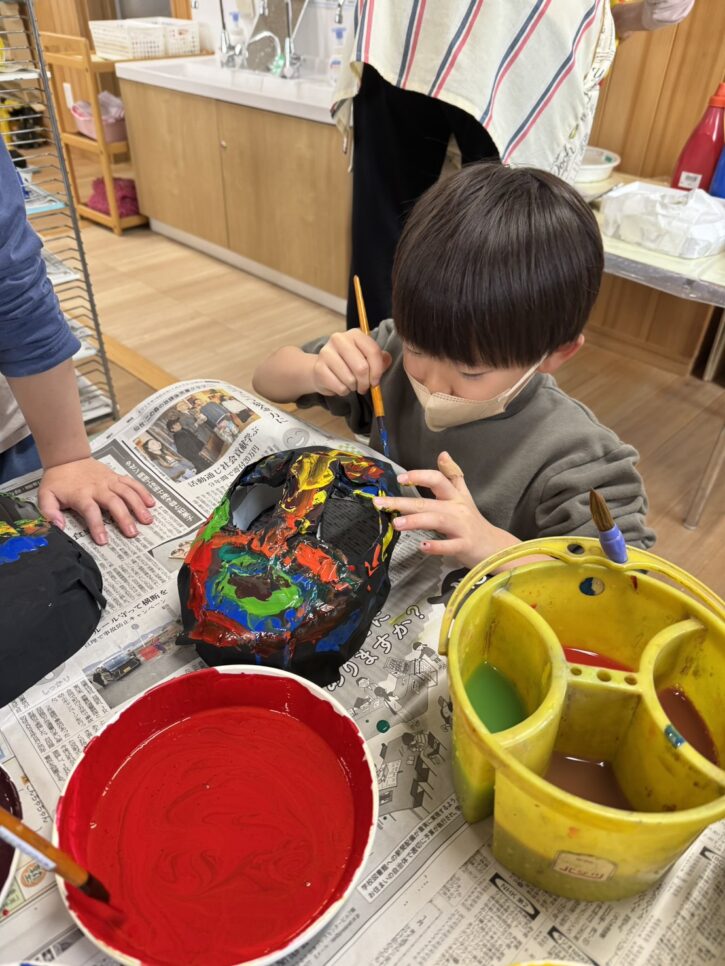 年長組では、障子紙を使った「張り子」のお面に挑戦です🔥