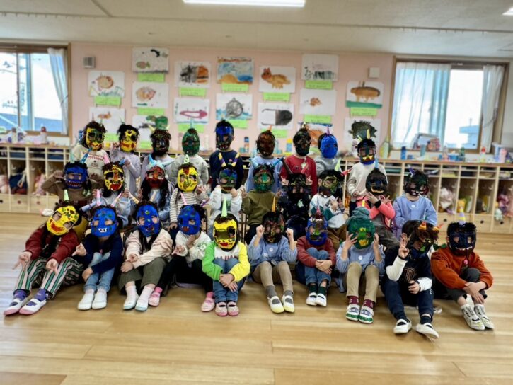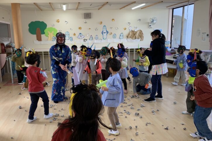 完成した鬼のお面を被って、豆まき会を行いました👹
