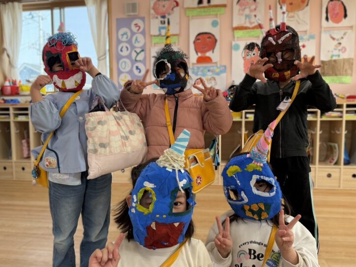 完成した鬼のお面を被って、豆まき会を行いました👹
