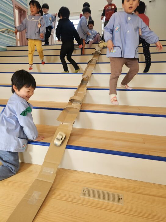 だんだんホールの階段では、長~い道路を作ってミニカーを走らせています。